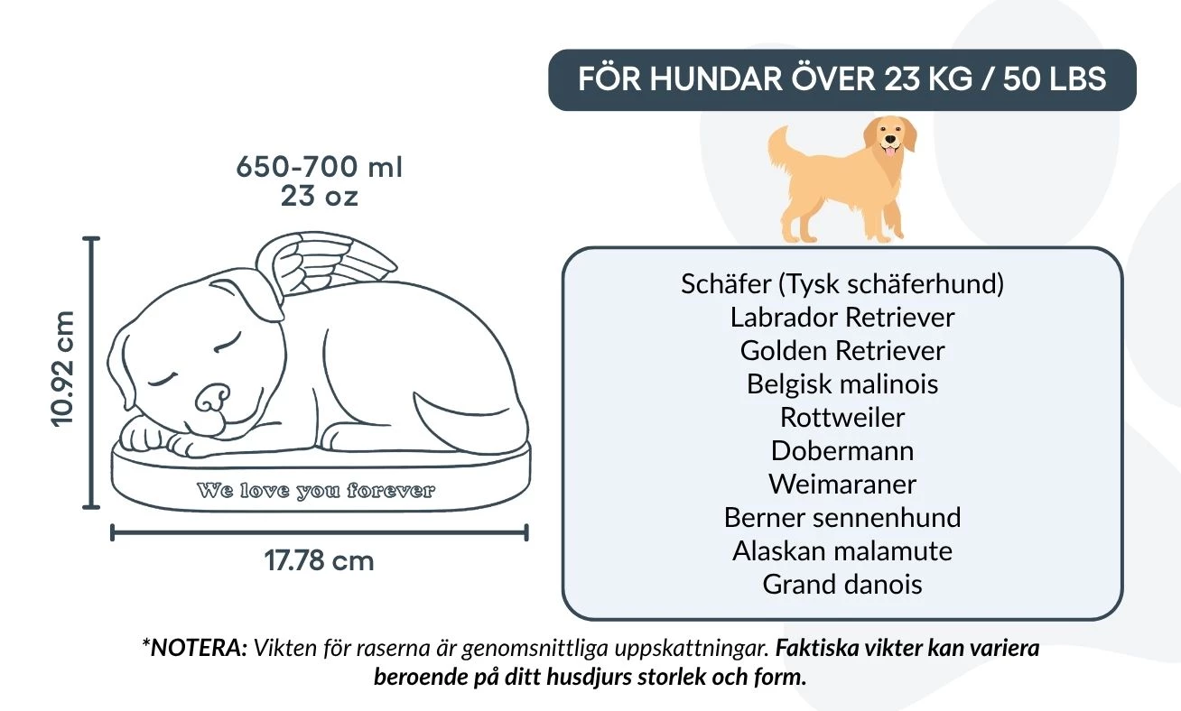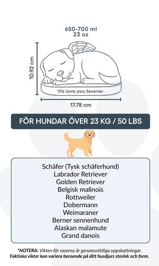 Let op: De inhoudsmaat is gebaseerd op gemiddelde crematiehoeveelheden. Houd rekening met het gewicht en de bouw van je huisdier bij het kiezen van een urn.