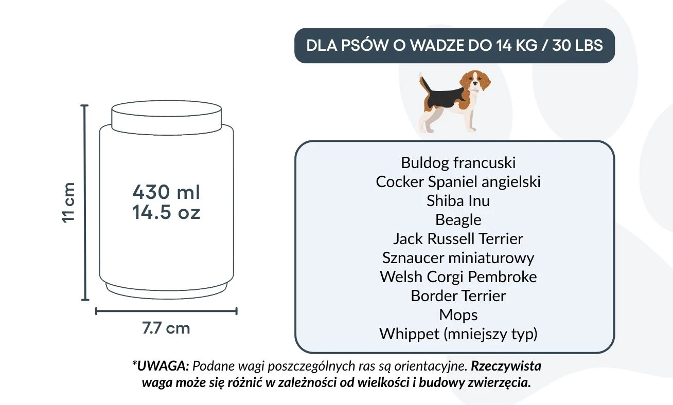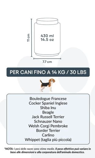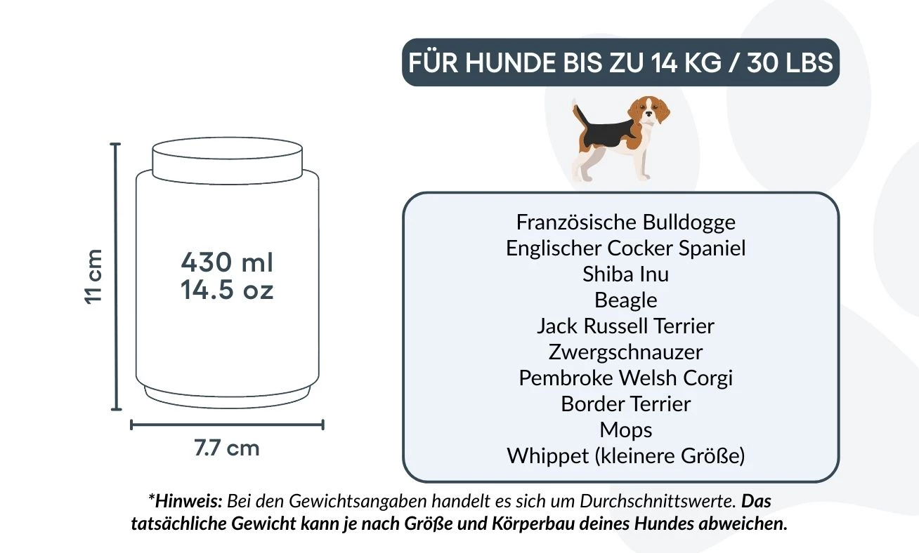 Klein: 7,7 cm (B) × 11 cm (H) × 7,7 cm (L) | 430 ml / 14,5 oz | Voor honden tot 14 kg / 30 lbs