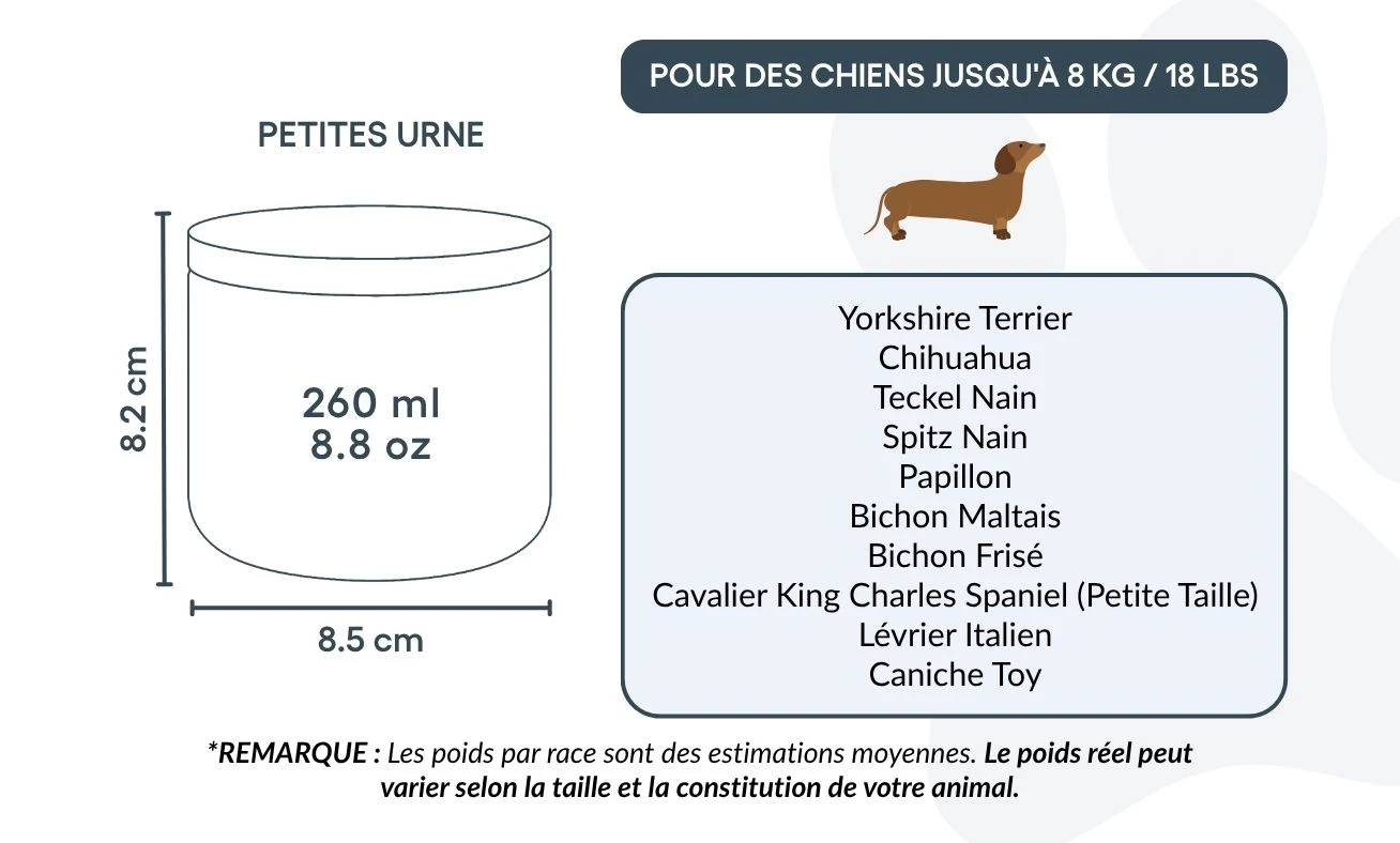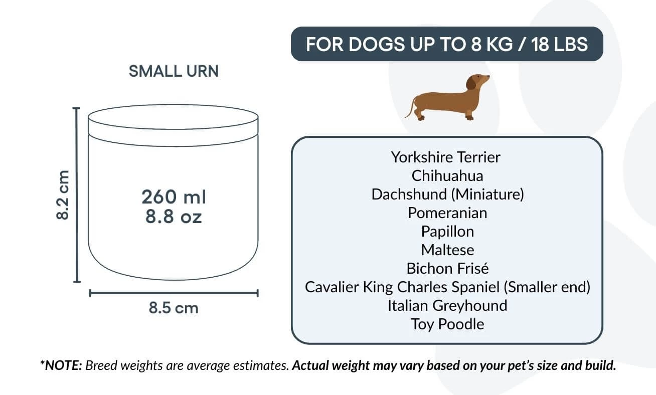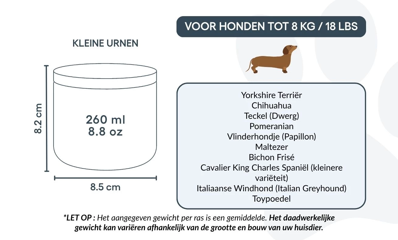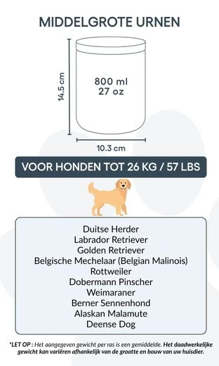 Verkrijgbaar in twee praktische maten voor kleine en middelgrote honden, biedt deze urn een respectvolle en persoonlijke manier om afscheid te nemen. Een doordachte keuze voor crematie, en een blijvend aandenken voor elke hondenliefhebber.