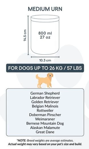 Perfect voor crematie of als herdenkingsurn, is deze keramische urn verkrijgbaar in twee maten voor honden tot 26 kg. Of ze nu op een plank, dressoir of gedenktafel staat, deze urn is meer dan een bewaarplaats — het is een liefdevol symbool van herinnering aan je dierbare hond.