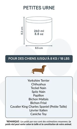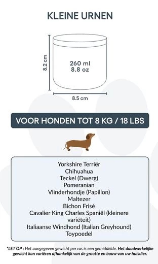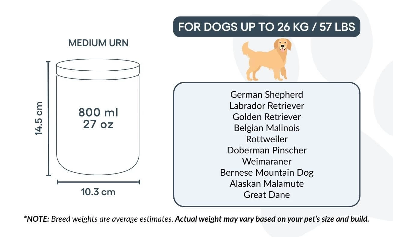 Perfect voor kleine tot middelgrote honden, is deze urn verkrijgbaar in twee maten tot 26 kg. Of je haar nu op een plank plaatst of op een rustige plek bewaart, deze urn vormt een eenvoudig maar oprecht aandenken aan de band die jullie deelden.