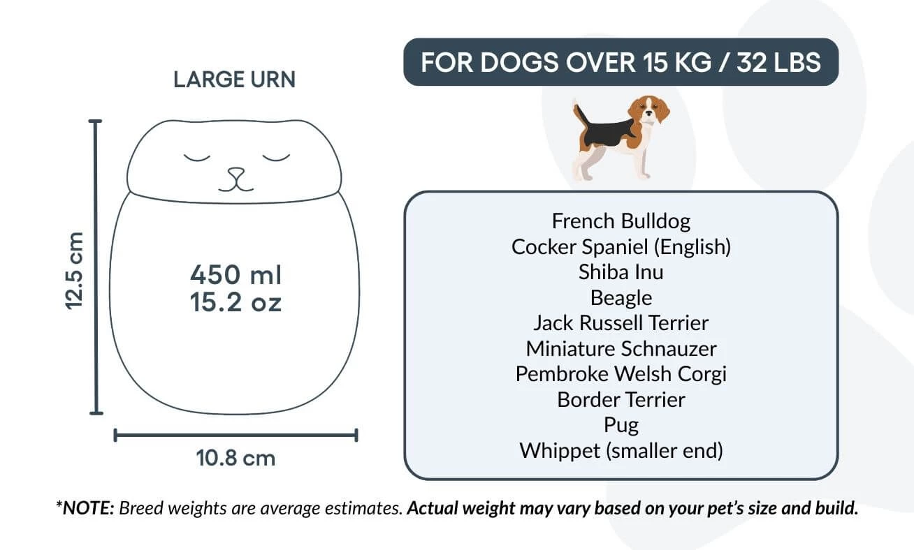 Deze keramische hondenurn biedt een vredige plek voor de as van je huisdier en eert hun herinnering met elegantie en liefde. De perfecte gepersonaliseerde urn om hun nalatenschap met waardigheid te bewaren.
