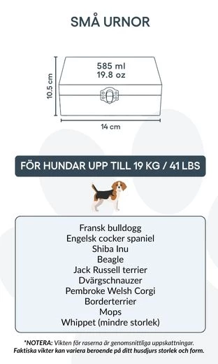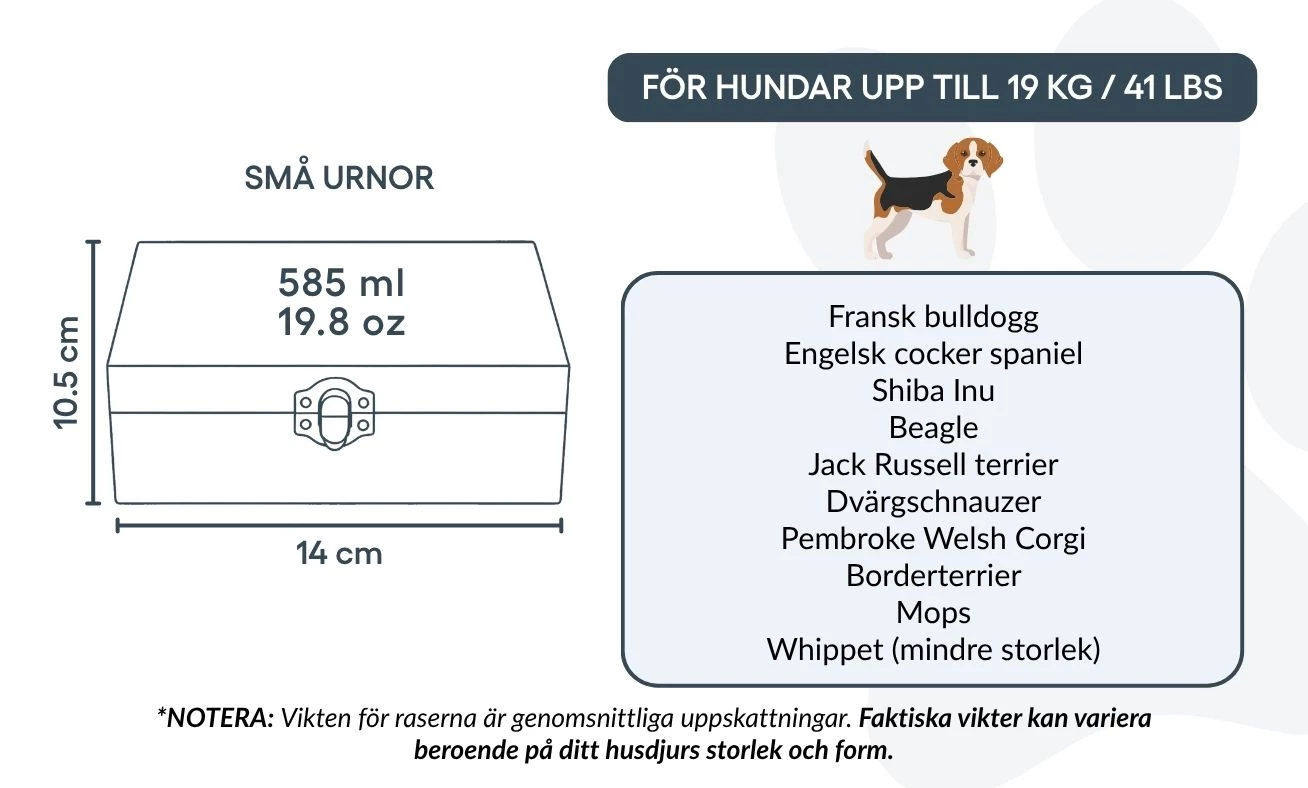 Let op: de inhoudsindicatie is gebaseerd op gemiddelde crematievolumes. Houd rekening met het gewicht en de bouw van je huisdier bij het kiezen van de juiste urn.