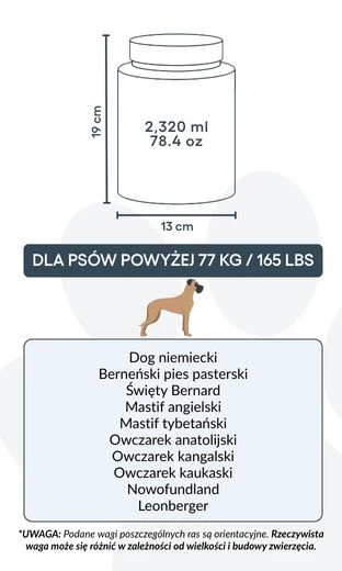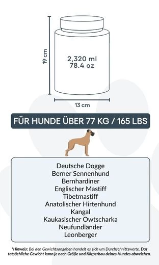 13 cm (B) × 19 cm (H) × 13 cm (L) | ca. 2.320 ml / 78,4 oz – geschikt voor honden tot ca. 77 kg / 165 lbs