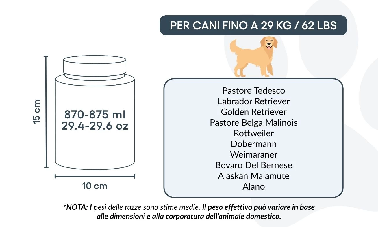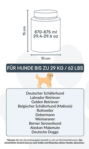 10 cm (B) × 15 cm (H) × 10 cm (L) | 870–875 ml / 29,4–29,6 oz – geschikt voor honden tot ca. 29 kg / 62 lbs
