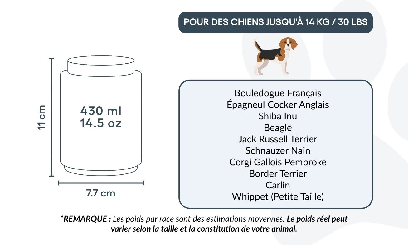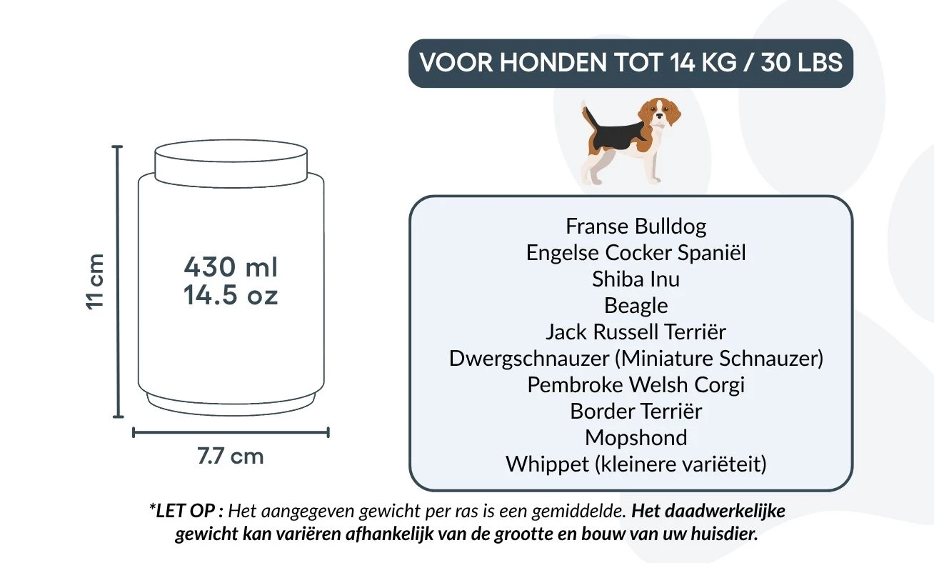 Klein: 7,7 cm (B) Ć 11 cm (H) Ć 7,7 cm (L) | 430 ml / 14,5 oz | Voor honden tot 14 kg / 30 lbs