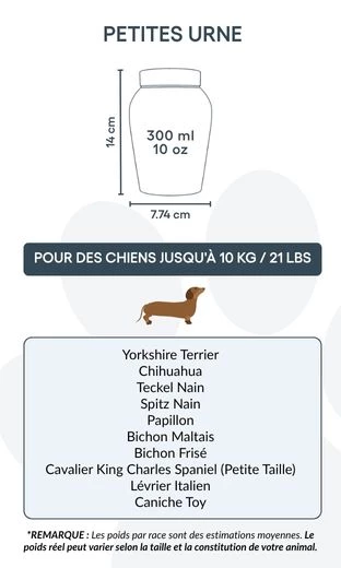 Keramische hondenurn met een subtiele illustratie, naam en data. Een gepersonaliseerde urn voor hondenas, ontworpen om je huisdier met eenvoud en zorg te eren.