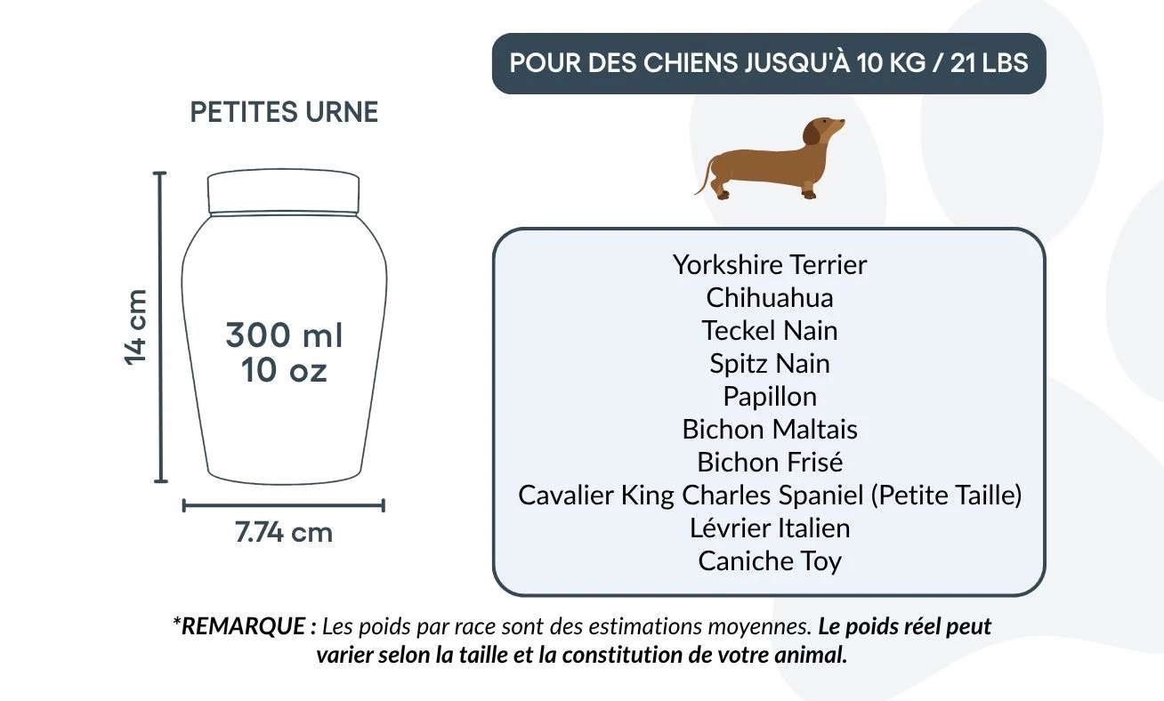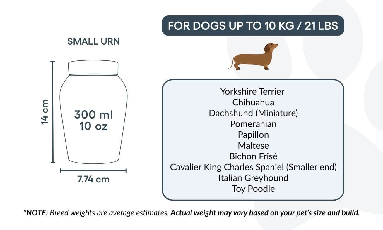 Keramische hondenurn met een subtiele illustratie, naam en data. Een gepersonaliseerde urn voor hondenas, ontworpen om je huisdier met eenvoud en zorg te eren.