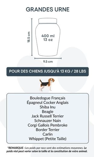 Keramische hondenurn met een subtiele illustratie, naam en data. Een gepersonaliseerde urn voor hondenas, ontworpen om je huisdier met eenvoud en zorg te eren.