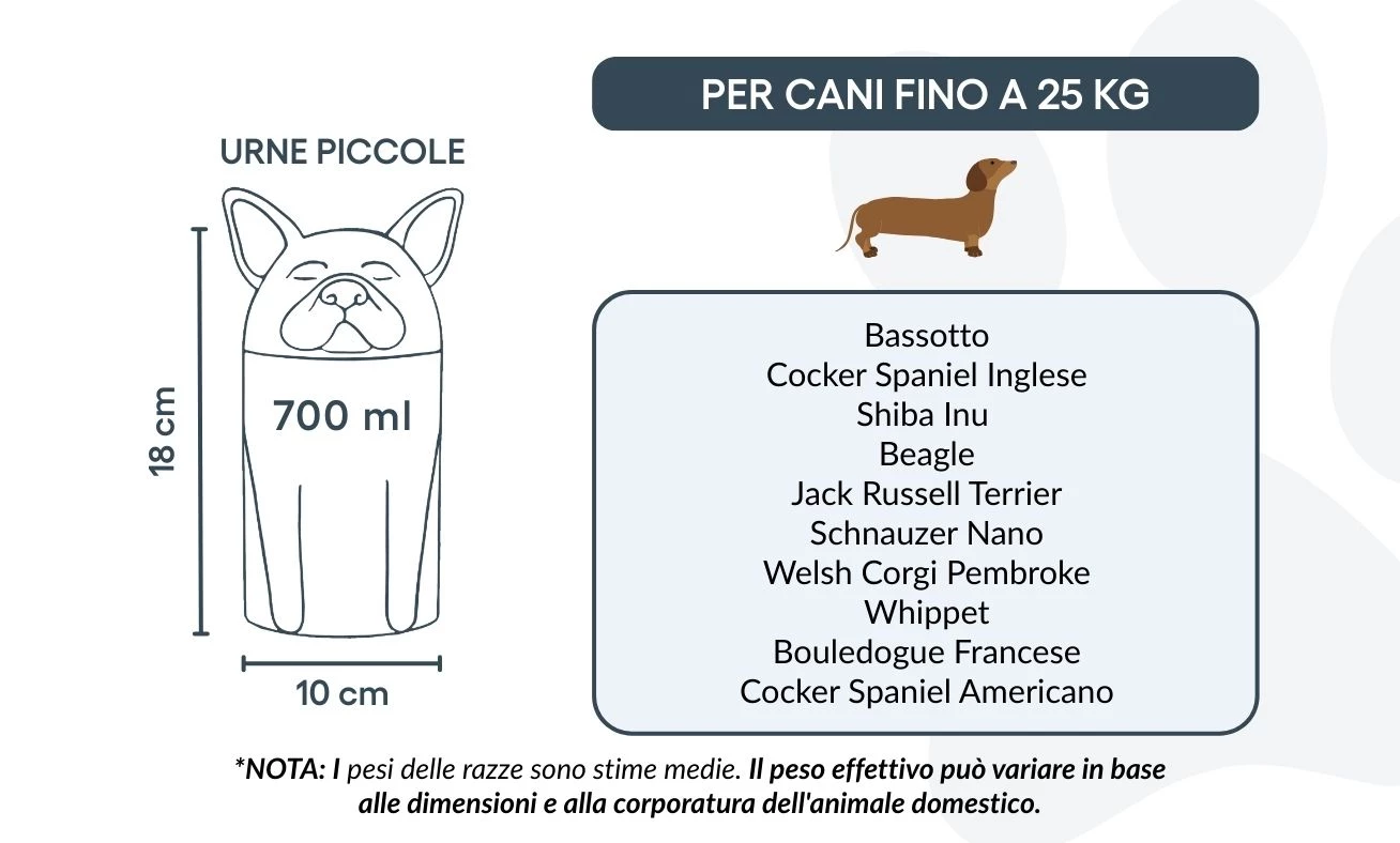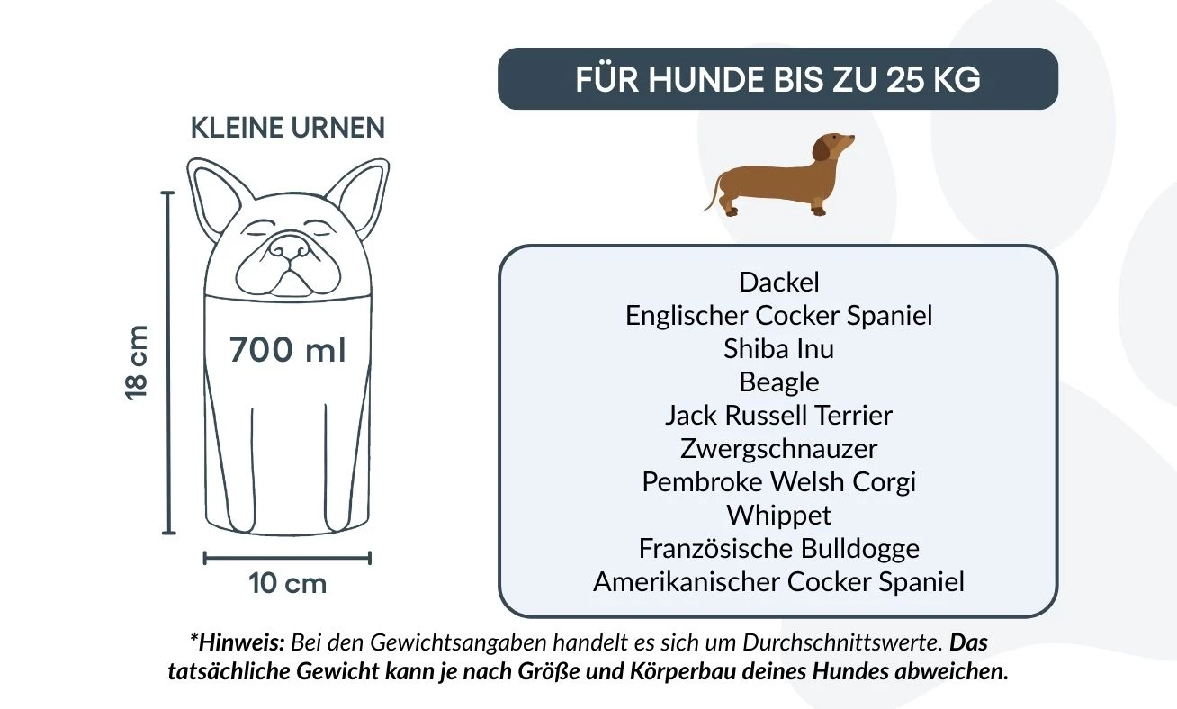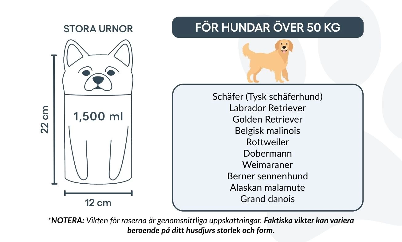 Let op: de inhoudsindicatie is gebaseerd op gemiddelde crematievolumes. Houd rekening met het gewicht en de bouw van je huisdier bij het kiezen van de juiste urn.